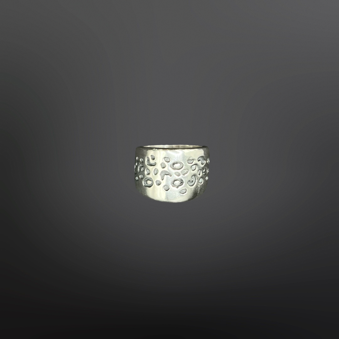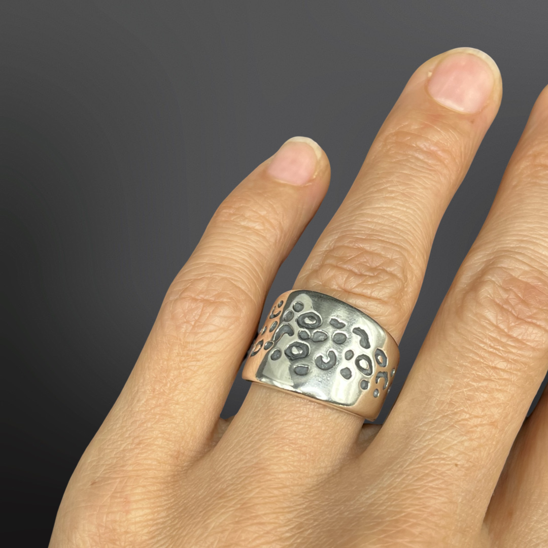 El anillo Namu no pasa desapercibido, es muy elegante pero nada tradicional, para mujeres de espíritu salvaje. Está hecho a mano en Plata 950, de acabado brillante y con técnica de oxidación bajo relive para las manchitas.